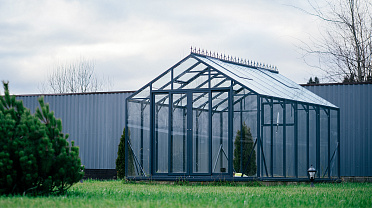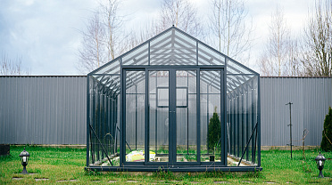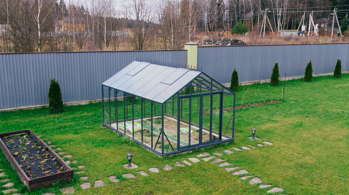 Выверенные пропорции и прямые стенки формируют удобное и функциональное пространство внутри. Теплица создаёт аккуратный архитектурный акцент на участке, обеспечивая комфортную работу с растениями и продуманную организацию посадок.