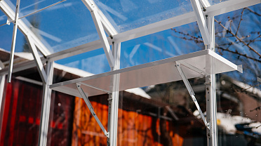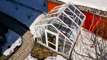 Теплица сохраняет выразительность и функциональность в любое время года. Летом она становится лёгким и открытым пространством, а зимой подчёркивает архитектуру участка, оставаясь надёжной и устойчивой в условиях снеговых нагрузок.
